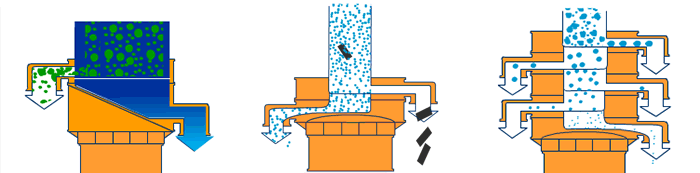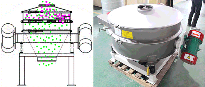 旋振篩,由單臺立式振動電機作激振源,電機上、下兩端安裝有偏心重錘,將電機的旋轉運動轉變?yōu)樗健⒋怪?、傾斜的三次元運動,再把這個運動傳遞給篩面,使物料在篩面上做外擴漸開線運動,故該系列振動篩稱之為旋振動篩。