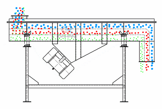 原理是利用振動電機(jī)激振器作為振動源,使物料在篩網(wǎng)上被拋起,同時向前作直線運動,物料從給料機(jī)均勻地進(jìn)入篩分機(jī)的進(jìn)料口,通過多層篩網(wǎng)產(chǎn)生數(shù)種規(guī)格的篩上物、篩下物、分別從各自的出口排出。