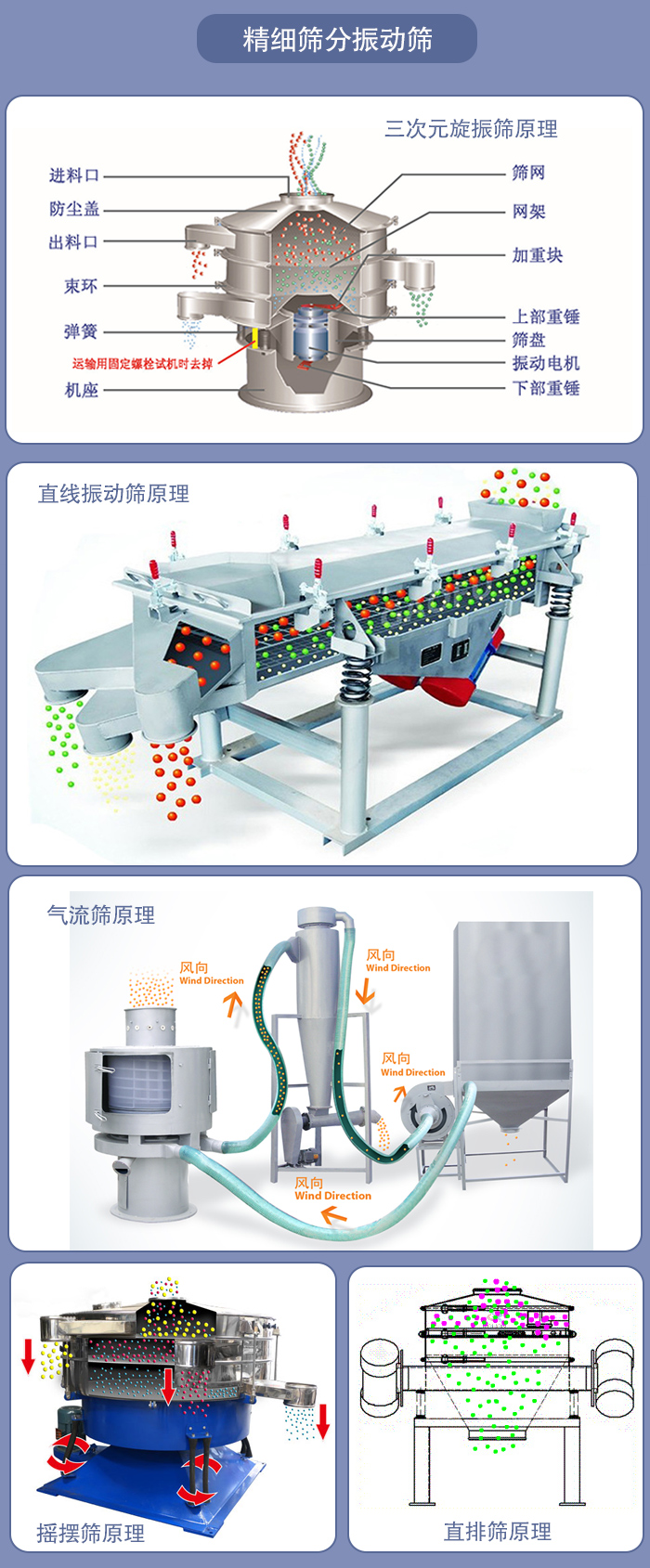 振動篩又被叫做篩粉機、電動篩,是一種適合與精細物料篩分的振動篩分機械設(shè)備,被各行各業(yè)所廣泛使用,尤其體現(xiàn)在食品行業(yè)和化工行業(yè)的生產(chǎn)活動中。振動篩設(shè)備分類廣泛,精細篩分設(shè)備是用處最廣的,那么小編今天就和大家分享精細篩分中各種篩分設(shè)備的原理。