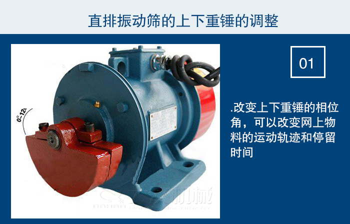 2. 下重錘不可調(diào)整角度,上重錘松開(kāi)鎖緊螺栓,可以隨意旋轉(zhuǎn)調(diào)整角度。在重錘上部安裝有刻度環(huán),對(duì)應(yīng)上重錘兩側(cè)有0°- 90°的刻度線(xiàn),將上重錘的刻度線(xiàn)從0逆時(shí)針調(diào)整到適當(dāng)?shù)目潭葦?shù)值,把固定螺栓上緊。將少量物料放在篩機(jī)上面,使篩機(jī)運(yùn)動(dòng),做篩面物料運(yùn)動(dòng)軌跡檢查,如處理參數(shù)都達(dá)到最佳效果后,停機(jī)上緊固定螺栓調(diào)整就結(jié)束了。切記上緊緊固定螺栓。
