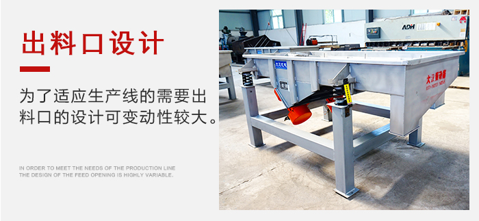 (2)多層直線振動篩出料口的設計可變動性較大,一切為了適應生產線的需要。例如多層直線振動篩的出料口的形狀有圓形的、方形的;出料口的伸縮方向可以設計成向前伸、向下伸、傾斜向下伸等。