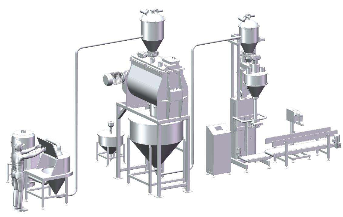 當(dāng)小袋物料需要拆包倒入下道工序時(shí),只需人工直接拆包放入系統(tǒng)即可。給料過程中產(chǎn)生的物料粉塵由除塵風(fēng)機(jī)收集。物料通過振動篩(安全篩)攔截散狀物料和異物,保證符合要求的顆粒順利輸入。