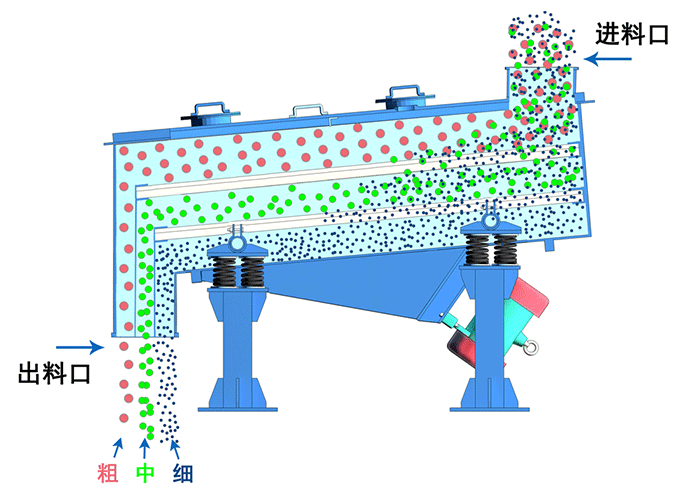 直線篩依靠?jī)蓚€(gè)相同頻率的反向電機(jī)使物料在篩面上直線向前跳躍,小于篩孔孔徑的物料通過篩網(wǎng)落入下層,將原本雜亂無章的顆粒分離,即按粒度分層,形成底部小顆粒、頂部粗顆粒的排列,從而達(dá)到對(duì)物料進(jìn)行篩分和分級(jí)的目的