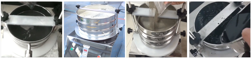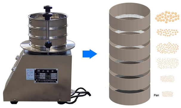 電磁試驗采用電磁振動器作為振動源,電磁振動器的振動帶動篩機低位振動,再通過底座傳遞到底座上由粗到細排列的一組標準試驗篩,同時安裝在下部的振動電機(或往復機構(gòu))將物料精選篩分,物料在標準檢驗篩的篩面上振動,使小于篩網(wǎng)孔徑的物料顆粒篩入下層檢驗篩,層層篩分,只有試驗篩的每一層都留有相同的粒徑,以達到不同的粒徑分離。
