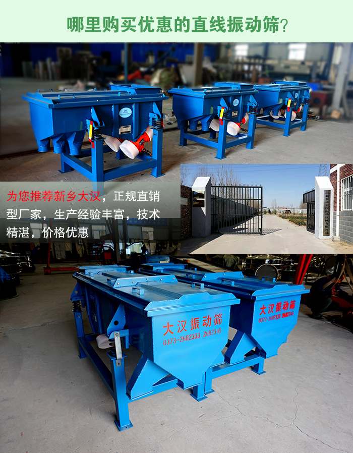 現(xiàn)提前預(yù)約,即可享受新折扣價(jià),您也可來(lái)廠對(duì)直線振動(dòng)篩進(jìn)行免費(fèi)的參觀與試機(jī),了解實(shí)際生產(chǎn)現(xiàn)場(chǎng)的運(yùn)行情況,大漢公司隨時(shí)期待著您的到來(lái)。