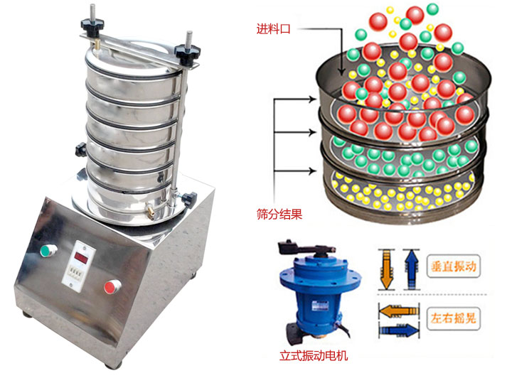準(zhǔn)試驗(yàn)篩是以YZU立式振動電機(jī)作為整機(jī)振動源,通過振動電機(jī)帶動上部振動盤振動,再通過振動盤傳導(dǎo)至安放在振動盤上部Φ200篩框上,然后由需要檢測目數(shù)的篩框把小于篩面網(wǎng)孔的物料顆粒篩分至下層篩框,如此層層篩選,使每層試驗(yàn)篩內(nèi)只留相同粒度的物料,達(dá)到不同粒度的分離并確定此物料的粒度組成,使Φ200型篩框中的物料能非常有效的起到過濾、分級、篩分目的。