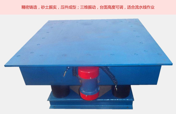 鑄造用振動平臺采用橡膠彈簧和6臺-8臺振動電機組合,具有上下,左右前后的三維振實效果,它具有多結構支撐,結構牢固,密封性好,性能可靠,操作簡單,振動頻率可調等特點。