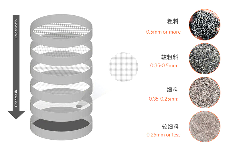 人工手篩費(fèi)時(shí),勞動(dòng)強(qiáng)度大,"機(jī)械篩分"將篩子按孔徑大小疊在一起,給料放在上面一層篩子上,并加上蓋和底盤,一般疊5-6個(gè)篩子,然后放在實(shí)驗(yàn)室振動(dòng)篩上進(jìn)行機(jī)械振動(dòng)篩分。通常振動(dòng)時(shí)間為20分鐘,檢測(cè)篩分質(zhì)量時(shí),再用篩機(jī)5分鐘,如每分鐘篩下量小0.2%試驗(yàn)樣量即為合格,對(duì)于粗粒,過(guò)篩率小于1%即可。為避免損失和延長(zhǎng)篩分時(shí)間,有時(shí)在開始篩分時(shí)先用較細(xì)的篩子將粉塵篩除。