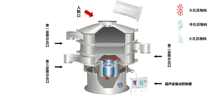 超聲波振蕩篩在直立式振動電機與超聲波換能器的共同作用下,實現物料的篩分/分級目的。直立式振動電機作為激振源,帶動物料和篩網的振動的同時,超聲波換能裝置實現對物料靜電,易聚團的抑制,保證物料的松散從而實現物料的篩分目的。